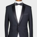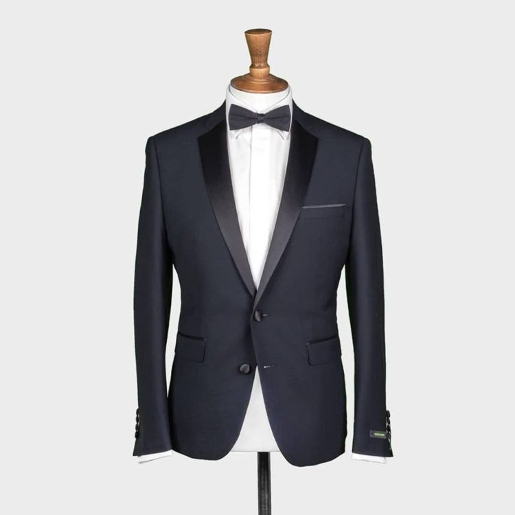 Exclusive to Hire Class by Remus Uomo. Slim fit wool blend, single breasted, one button, with black satin on slim lapel, flat fronted slim leg trouser.