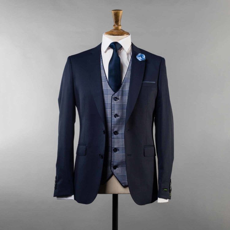 Hire Class by Remus Uomo, Navy tapered fit wool-blend suit, single breasted, two button with modern flat fronted trouser. Can be worn with matching waistcoat or choose another from our exclusive range.