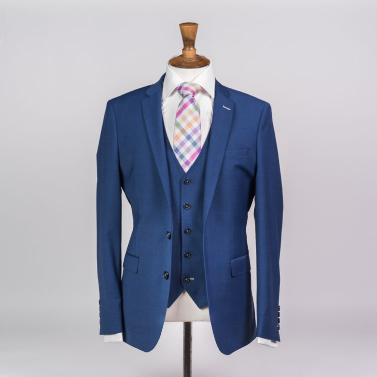 Blue two buttoned,Tapered fit jacket, with a soft checked pattern. Worn with matching flat front trousers. Can be worn with matching waistcoat or choose from our exclusive range of coordinating waistcoats. Available in boy’s.